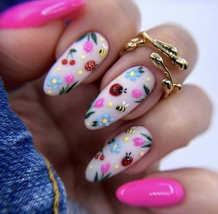 В моде весны 2025 — цветные ногти. Если вы любите более сдержанные и универсальные варианты — просто цветной декор. Его легко выполнить дотсами или кончиком кисточки. Раньше мы писали о красивом цветочном маникюре, а теперь покажем, как еще можно декорировать ногти.