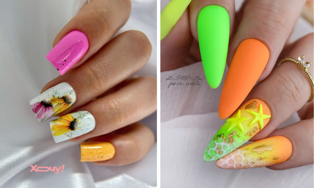 В тренде — сочетание горячих, летних цветов. Уместным остается декор в виде стемпинга, наклеек или слайдеров. Этим летом в моду возвращаются омбре и градиент. При этом форма и длина ногтей — по вкусу женщины.