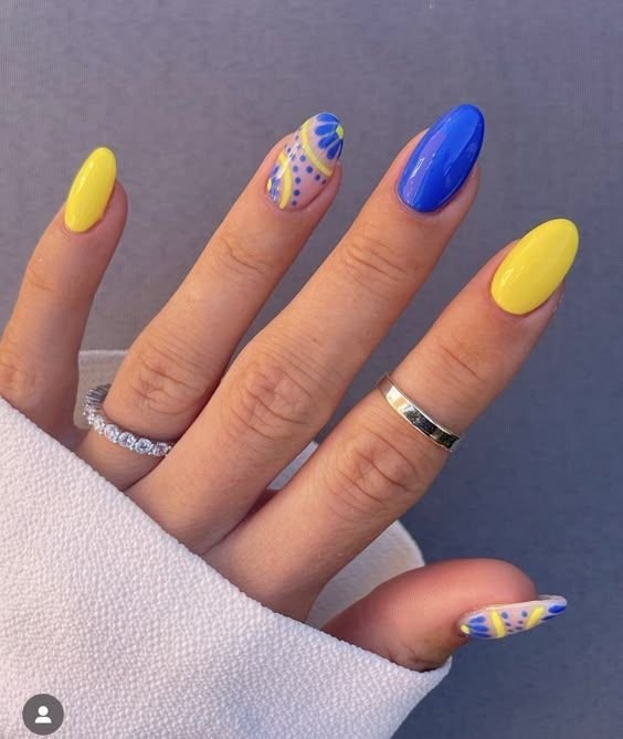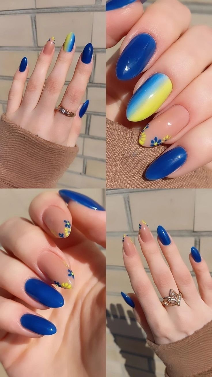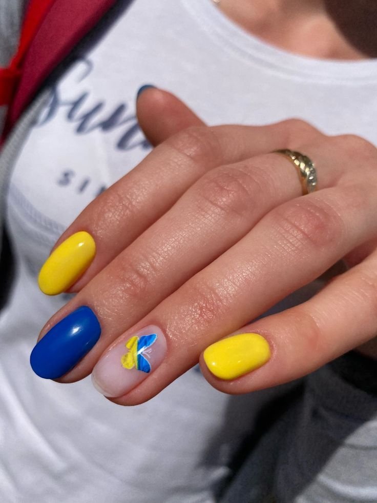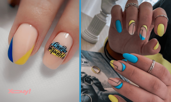 В тренде — сине-желтые оттенки с декором. Это могут быть тематические цветы, сердечки, изображения истребителей, джавелины, “боевых гусей”, котиков ВСУ и другие. В тренде — цветные сердечки соответствующих оттенков и френч с патриотическими надписями.