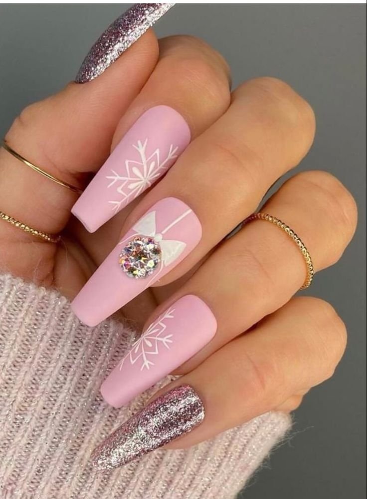 Не выходит из моды эффект снежных ногтей, когда белый фон украшается акриловой пудрой, имитируя объемный снег. Рождественские елочные шарики можно рисовать блестками, стразами, или клеить одну большую стразу.