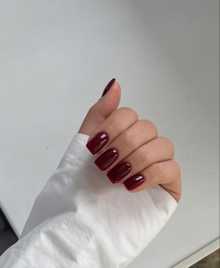 Когда хочется добавить образу магнетизма и драмы, на помощь приходит бордовый. Глубокий винный цвет всегда ассоциируется с роскошью и уверенностью. Это идеальный вариант для важных событий и вечерних выходов, делающий руки центром внимания, не теряя при этом благородной сдержанности.