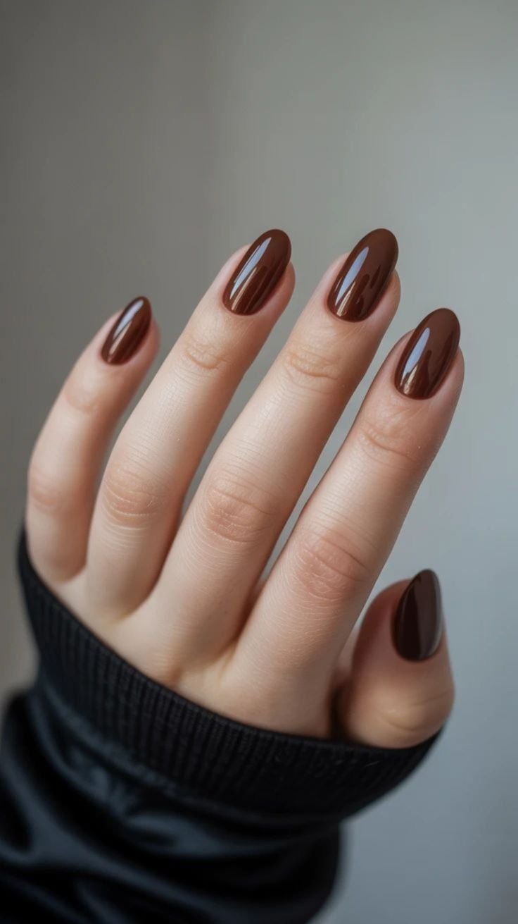 Шоколадный оттенок – это «новый черный» для тех, кто ценит мягкость и глубину. Он выглядит гораздо нежнее темных цветов, но при этом сохраняет изысканность. Этот цвет идеально подчеркивает светлую кожу, делая маникюр зрительно дорогим и уютным.