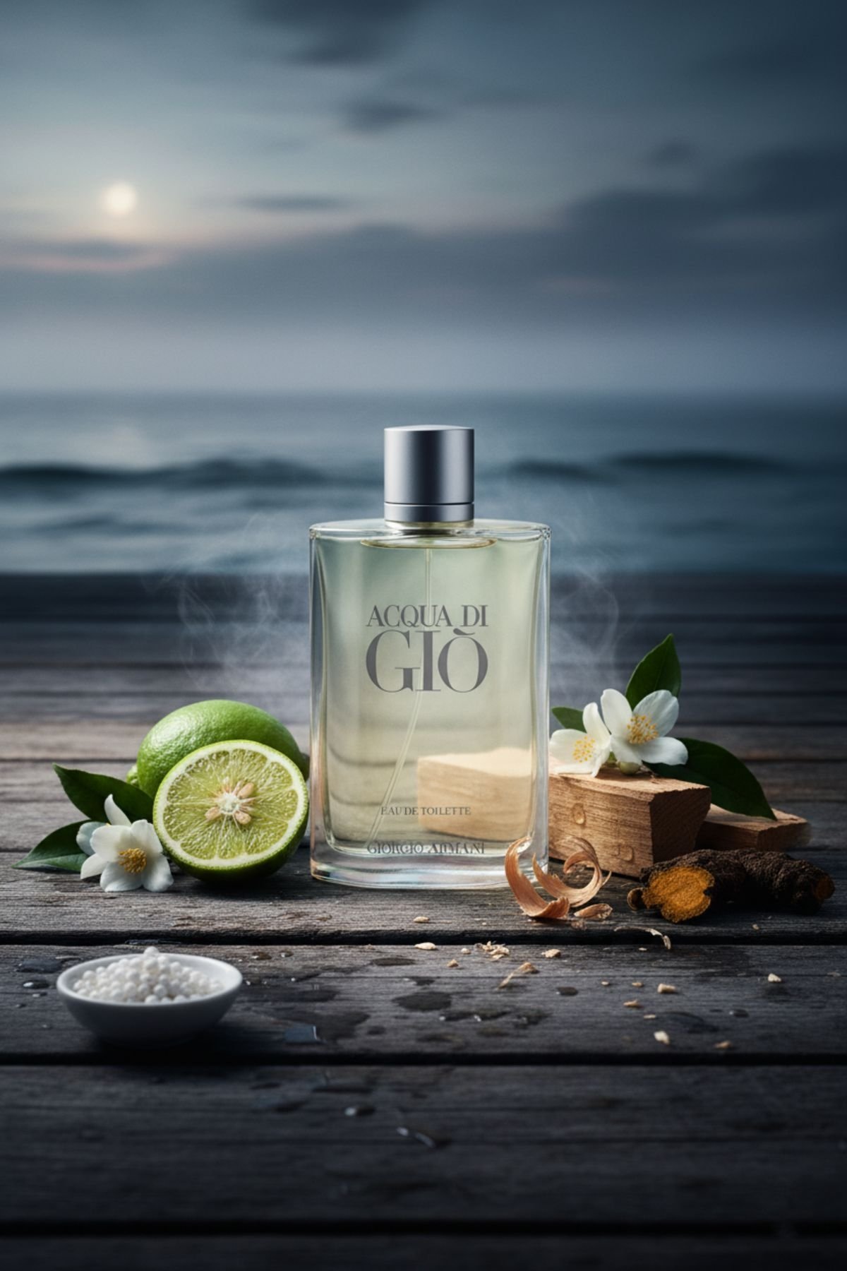 Acqua di Gio стала его личным манифестом. Простой флакон, нарисованный собственноручно написанными буквами Gio, и композиция, легче утреннего тумана над морем. Душистый горошек формирует нежный воздушный вздох, жасмин, фрезия и гиацинт придают свежести, мускус дарит чистоту. А матовое зеленое стекло выглядит так, будто его отполировали морские волны.