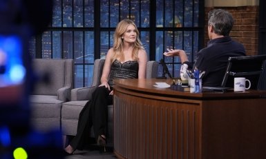 35-летняя американская актриса Мэган Фэйхи стала гостьей 1690 эпизода 12 сезона ток-шоу Late Night with Seth Meyers. В студию она вошла в модном ансамбле черного цвета.