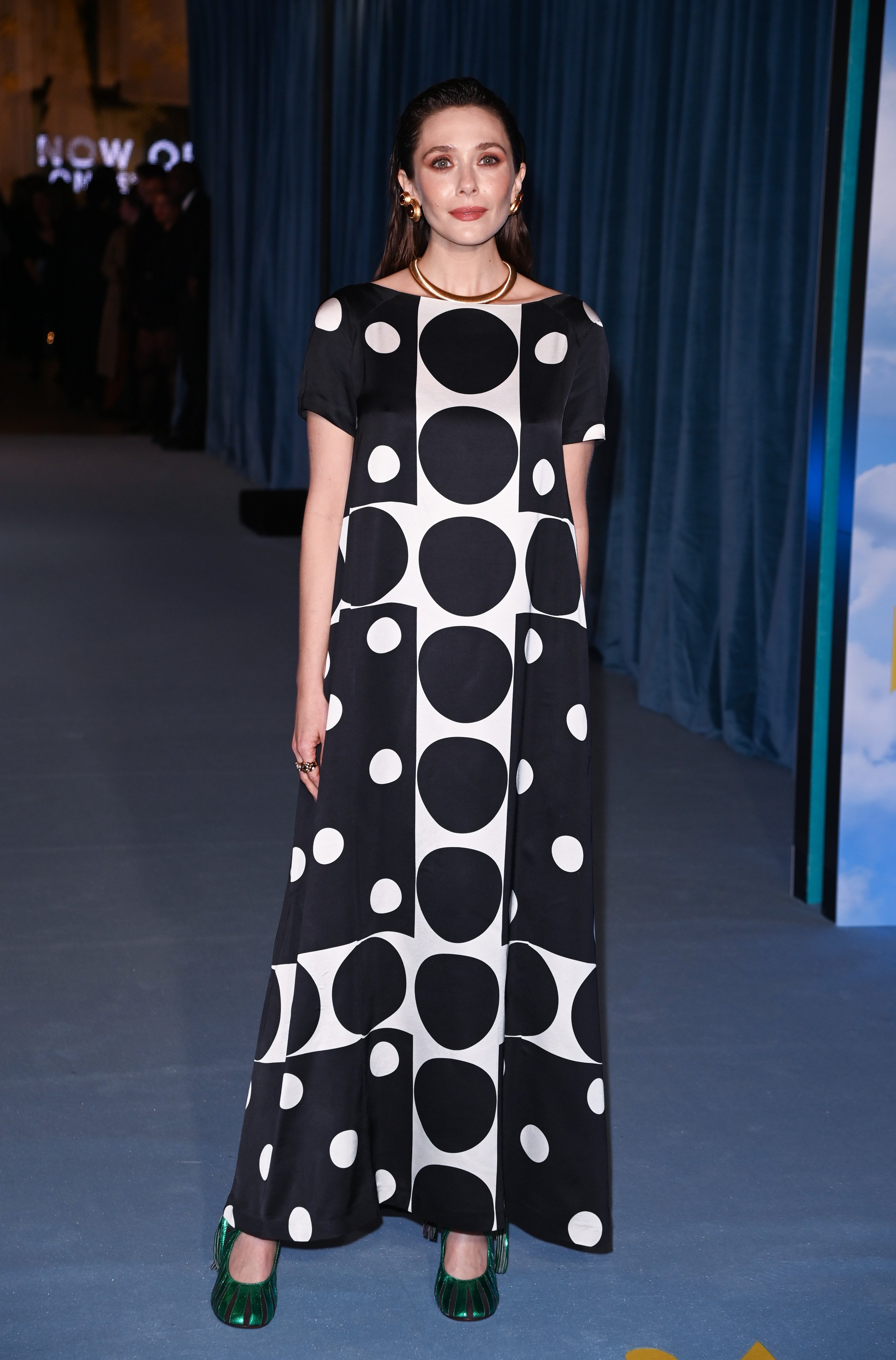 Основой образа стало черное макси-платье свободного кроя с короткими рукавами, украшенное горохом разного размера. Такой фасон довольно опасен, потому что визуально "съедает" силуэт. Собственно, это и произошло… Элизабет словно "спряталась" в этом платье. Также она дополнила образ изумрудной обувью и массивными золотыми украшениями. Получилось слишком много акцентов, принимающих на себя ненужное внимание.