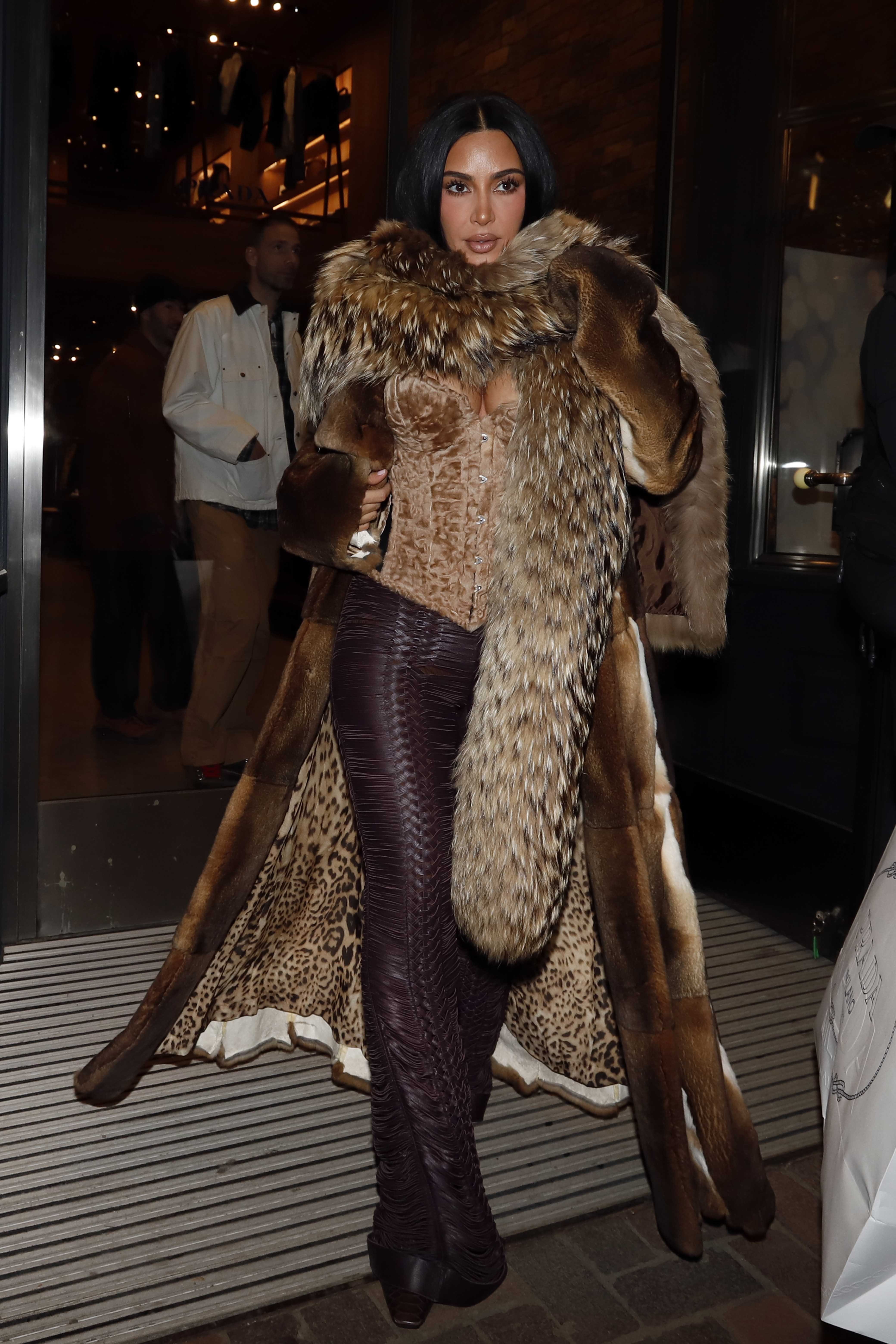 Ким выбрала длинное коричневое пальто интересного кроя, имеющего "леопардовую" подкладку и меховую отделку. Сложилось впечатление, что звезда только что вышла из леса… Модного настроения образу задавали "пушистый" светло-коричневый корсет в паре с расклешенными кожаными брюками темно-фиолетового цвета. Высокие каблуки придали силуэту четкости и вытянутости. Волосы она оставила распущенными, сделав акцент на выразительном макияже глаз.