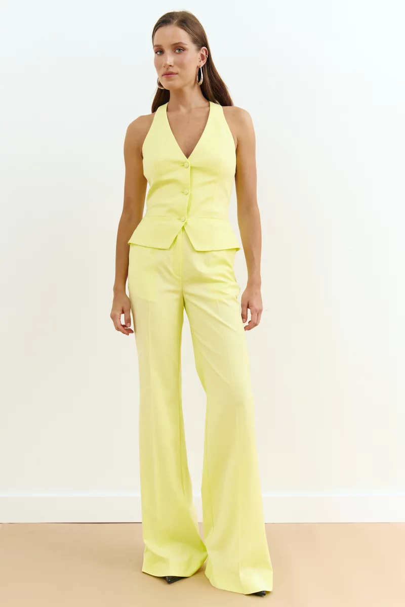 Вместо жакета или блейзера отдайте предпочтение трендовому жилету - это освежит образ. А чтобы он выглядел интереснее, выберите лук в ярком цвете.