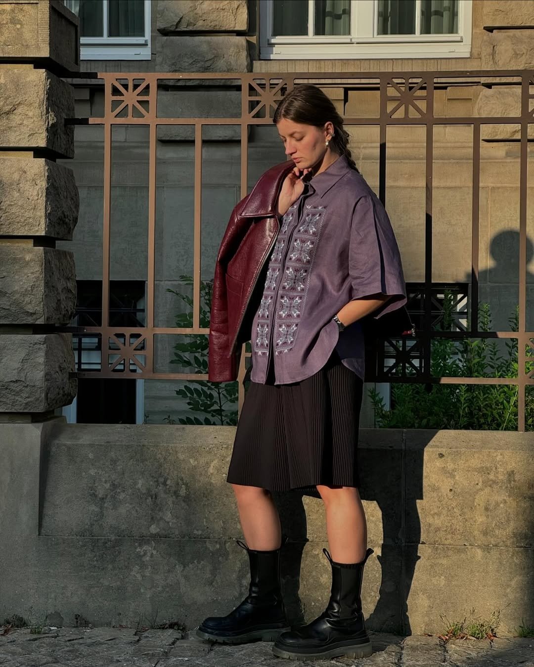 В зависимости от их фасона, носите вышиванку на выпуск, заправив в пояс один край или полностью. На ноги можно надеть трендовые кроссовки, лоферы, мюли и т. д. Также обычную кожаную сумку можно заменить на плетеную соломенную, чтобы сделать образ более интересным.