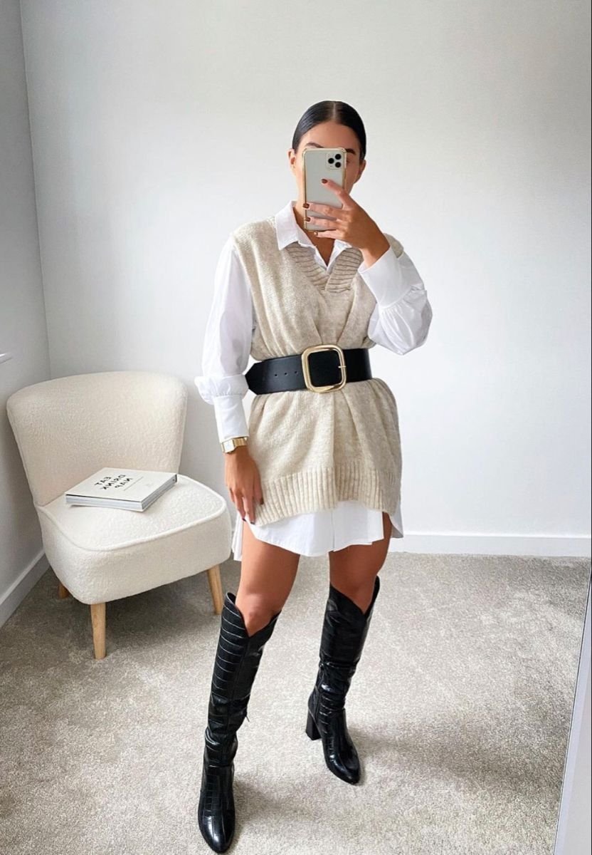Удлиненная oversize рубашка легко трансформируется в платье. Достаточно подчеркнуть талию ремнем, чтобы получить стильный и женственный аутфит без лишних усилий. Также сверху можно накинуть вязаный жилет или свитер – образ станет еще более интересным.