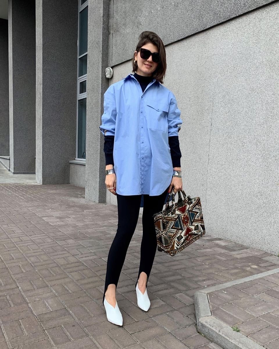 Рубашка и лосины со штрипками – дуэт, сочетающий комфорт и стиль. Это модное сочетание подойдет для осенних прогулок или городского темпа жизни.