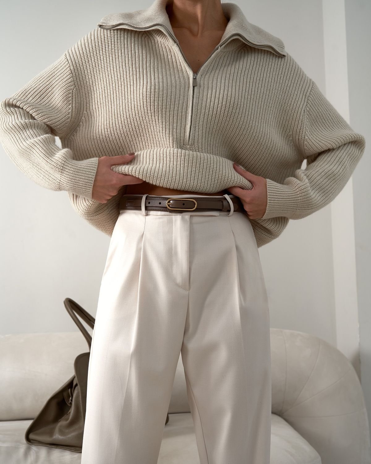 Для такого сочетания лучше всего подходят брюки прямого кроя или slim, красиво входящие в высокую обувь. Темные сапоги – черные или шоколадные – добавляют глубины и создают стильный контраст со светлым верхом и низом. Дополните образ структурированным жакетом и тонким гольфом – получится база в стиле современного городского минимализма.