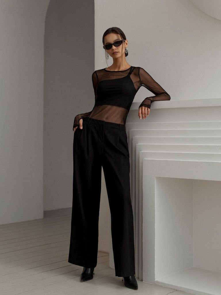 Полупрозрачный топ со штанами-палаццо создает легкий и деликатный образ, играющий на контрасте прозрачности и плотности. Прозрачность здесь не о смелости, а о легкости и глубине силуэта. Бралет или плотный топ помогает сохранить деликатность и элегантность образа.
