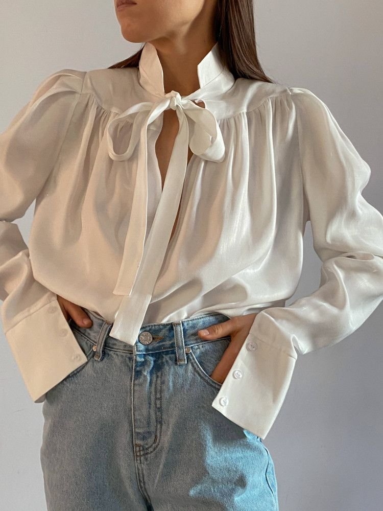 Легкая сатиновая блуза с бантом отлично работает с жесткими джинсами – это простой прием, который формирует четкую визуальную логику. Контраст фактур придает образу современности и небрежной элегантности. Обувь с острым мысом мягко извлекает силуэт и делает образ завершенным.