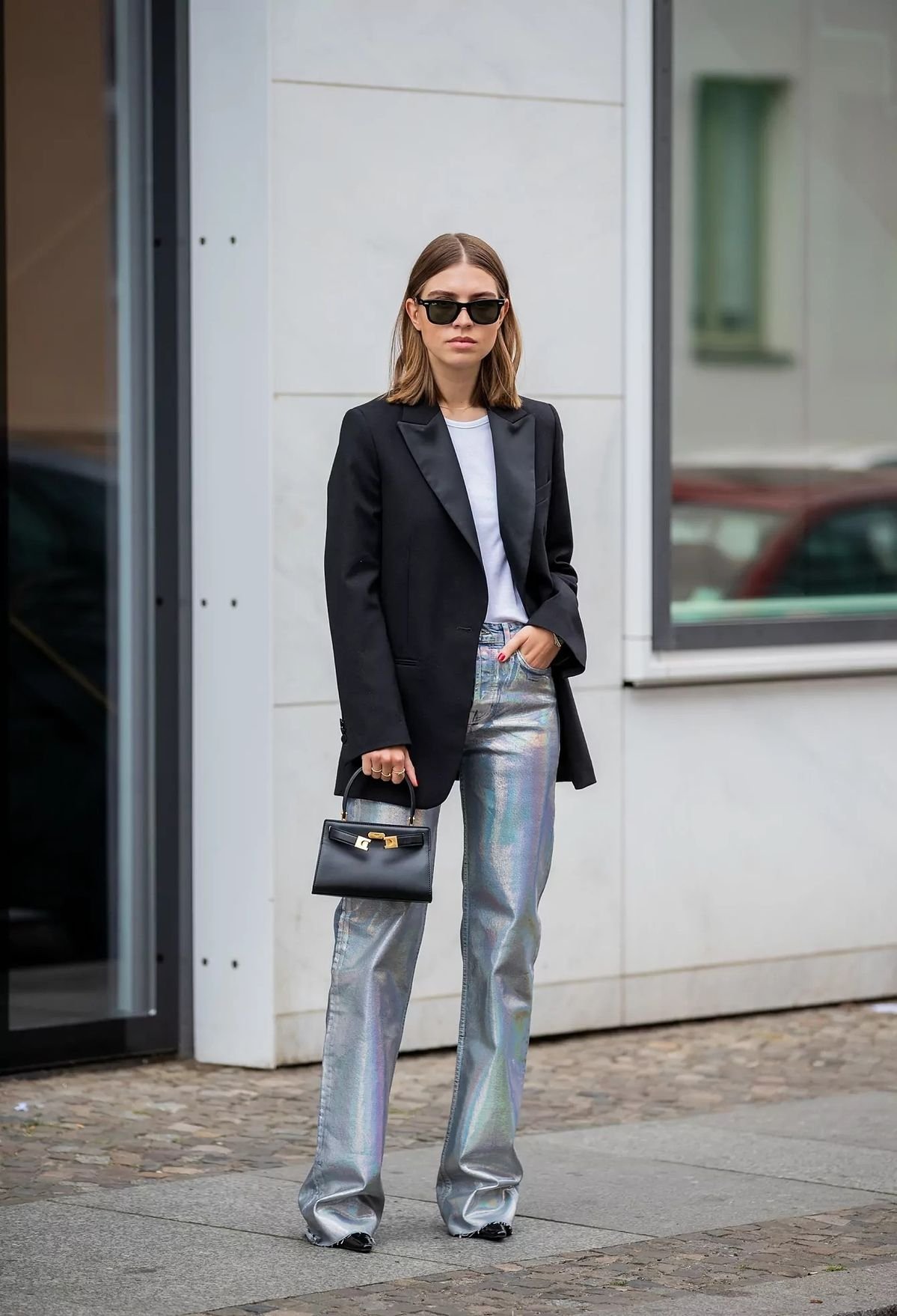 Для тех, кто готов к модным экспериментам, деним с металлическим финишем стал настоящим открытием. Золотое или серебряное напыление превращает джинсы в главный акцент образа. Такая вещь настолько самодостаточна, что лучше всего смотрится в паре с максимально простой базой: белой футболкой, мужским жакетом или лаконичным лонгсливом.
