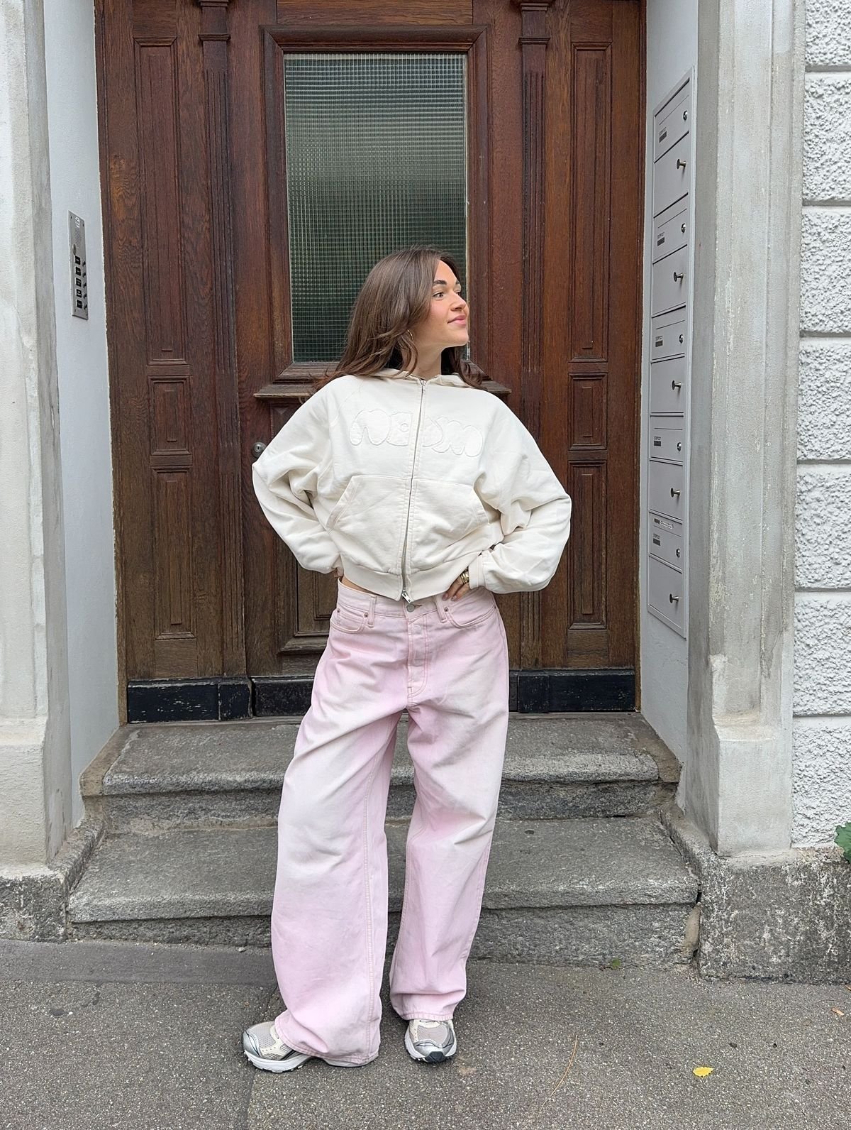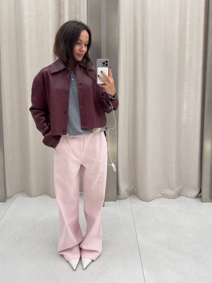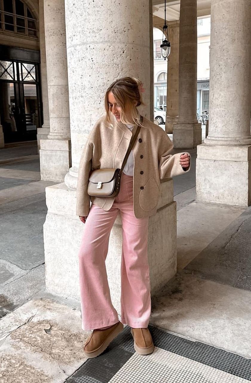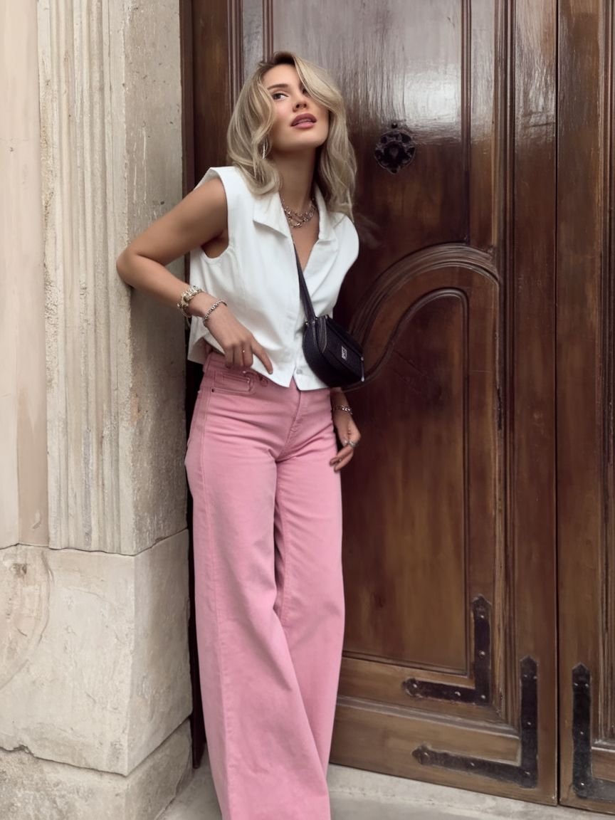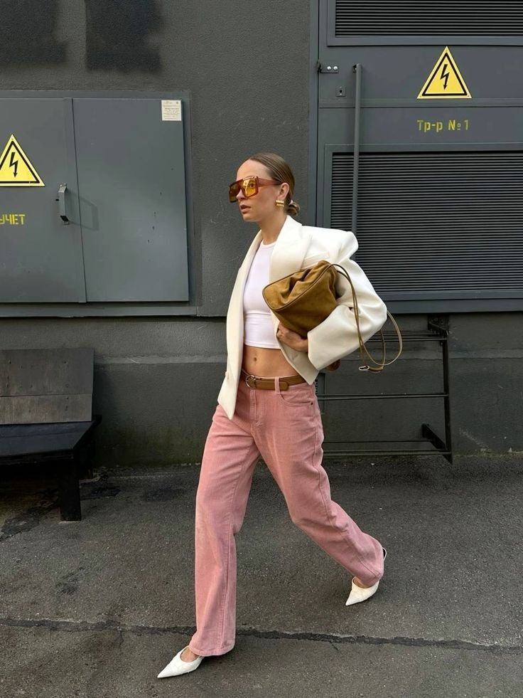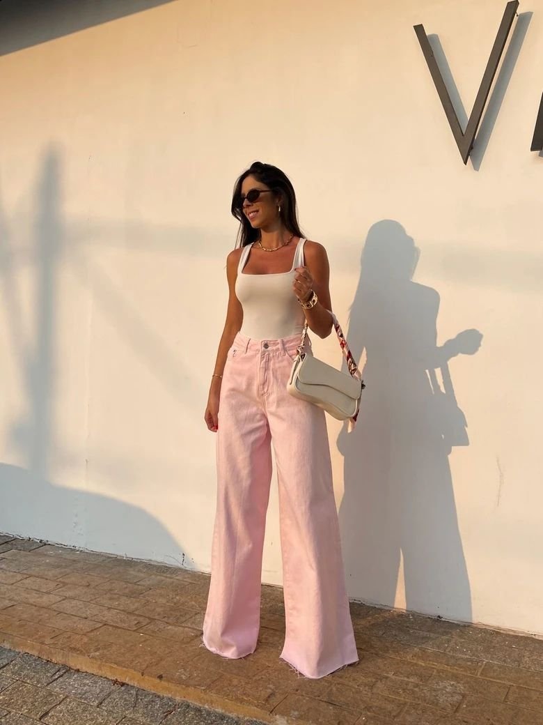 Кроме того, розовый деним придает образу мягкости и свежести. Благодаря плотной ткани цвет выглядит более приглушенным и благородным, поэтому джинсы легко вписываются даже в офисный стиль с нестрогим дресс-кодом. Достаточно дополнить их лаконичной обувью, минималистической сумкой и сдержанными аксессуарами — и получите современный городской образ.