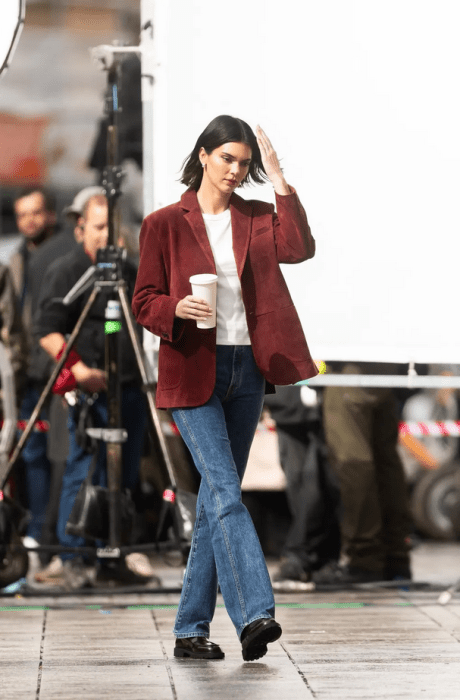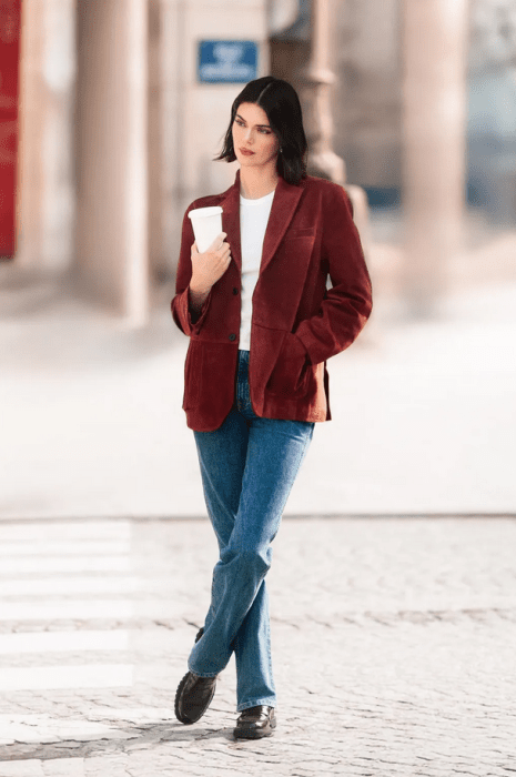 В кадре Дженнер предстала в стильном образе, который состоял из белой футболки, синих джинсов и темно-красного замшевого блейзера. Дополнили образ серьги от MÉGA и пара лоферов Penny в оттенке бургунди от Thursday Boots за 140 долларов (около 5,8 тыс. грн).