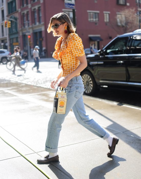 С сумкой в виде коробки из-под апельсинового сока: весенний лук Джиджи Хадид (ФОТО)