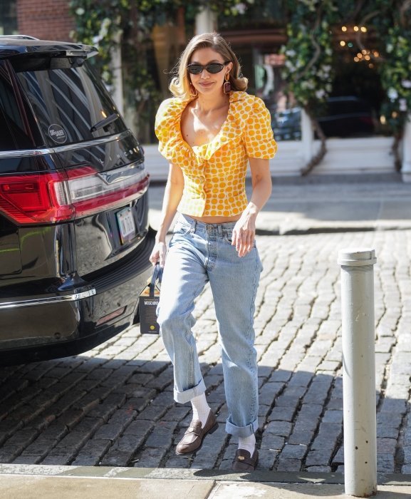 Для своего появления на публике красавица выбрала лук, который подходил для этого мероприятия. На ней был винтажный белый топ с пышными рукавами в принт оранжевый горошек от Morton Myles for the Warrens. Она носила его со светло-голубыми джинсами, которые немного подвернула. На ногах у Хадид были белые носки и каштановые кожаные мокасины, а в ушах - массивные серьги.