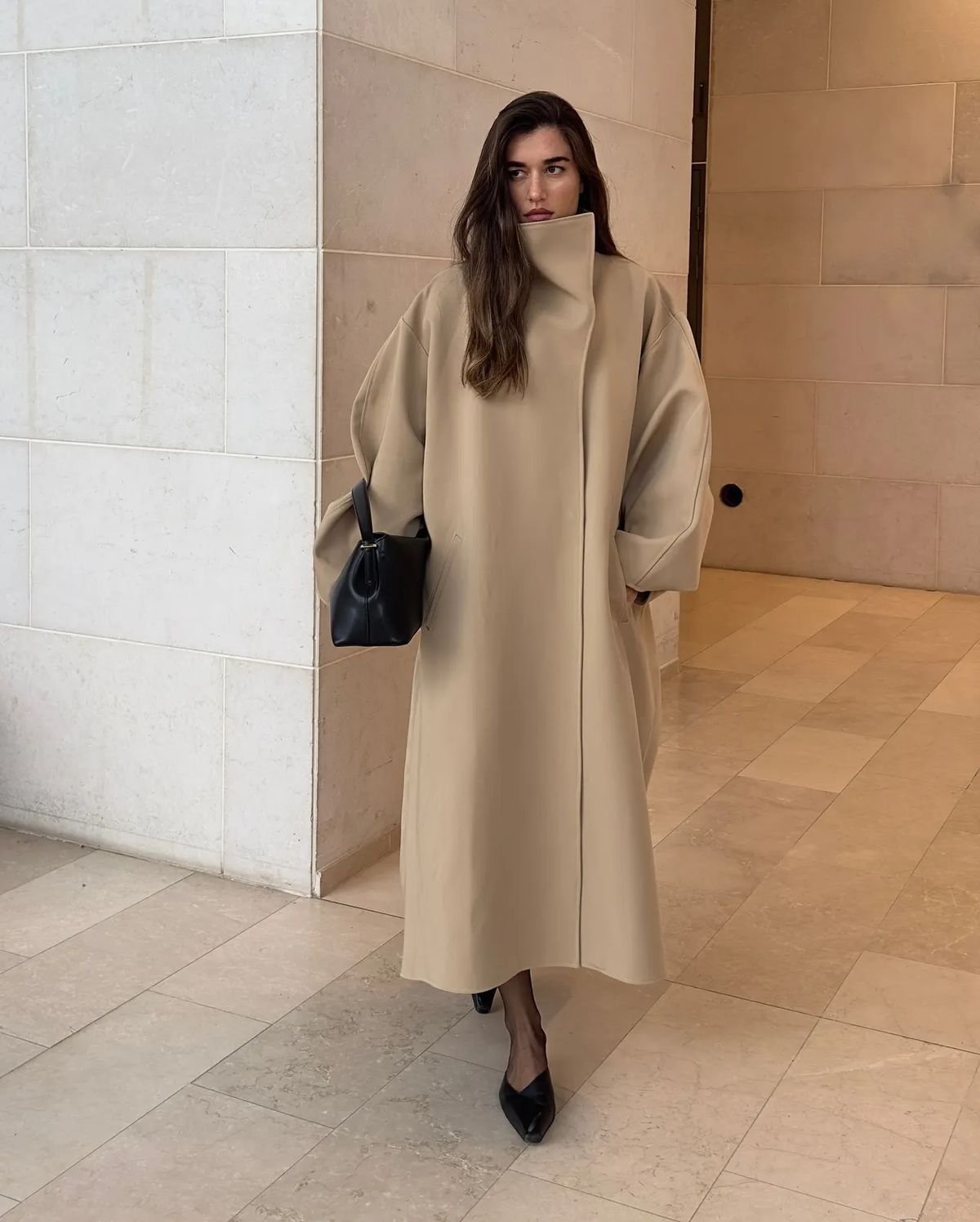 Сдержанное, элегантное и максимально практичное решение. Воротник-стойка или полустойка защищает от холодного ветра и создает четкую графику в образе. В 2025-м такие модели особенно актуальны, особенно в исполнении из плотных шерстяных тканей.