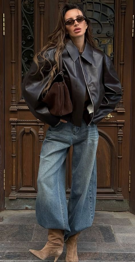 Современная кожаная куртка – это акцент, который работает без лишних слов . Она легко подчеркивает элегантность платья-комбинации, придает ритму костюму с мужским кроем и создает стильный контраст с денимом.
