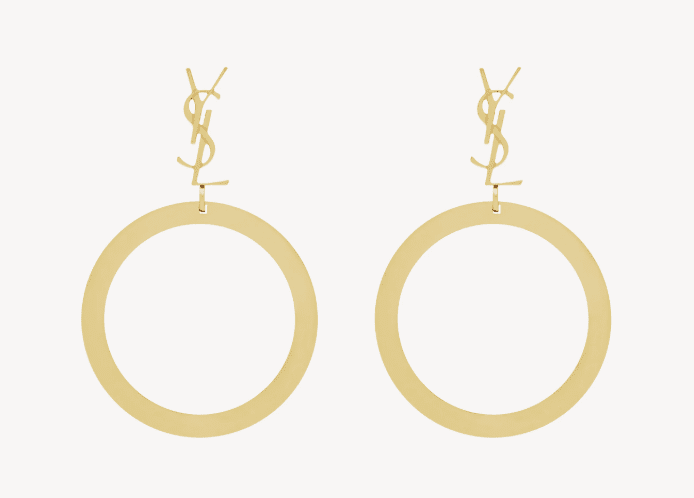 Серьги Saint Laurent: Cassandre pendant hoop earrings in metal. Фото: reversible.com/shopping/women