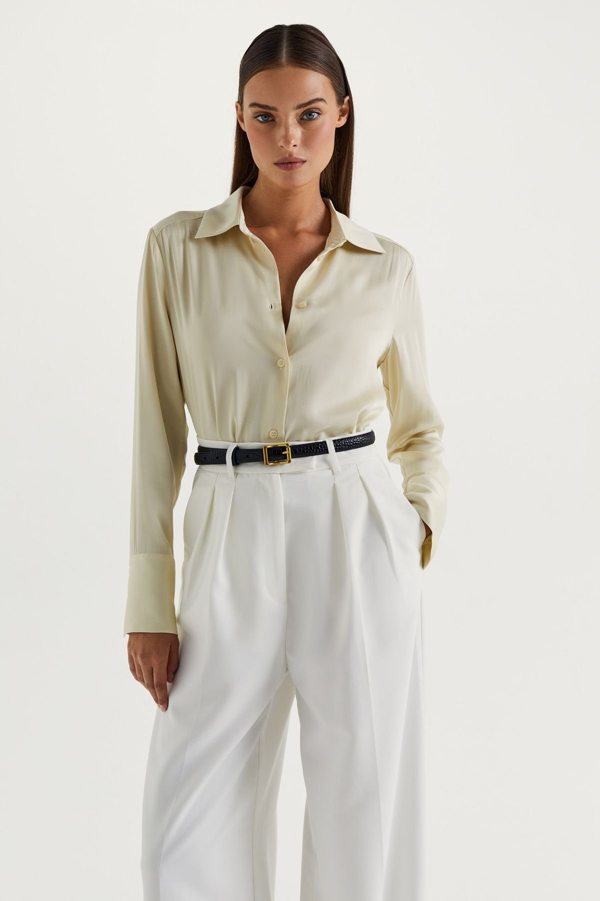 1.Классическая рубашка (не обязательно белая) — универсальная вещь, легко интегрирующаяся в любые образы, от деловых до повседневных. Она придает структуру, чистоту линий и лаконичность. Благодаря классическому крою рубашка становится базой для многослойных комбинаций, обеспечивая цельность любого комплекта.