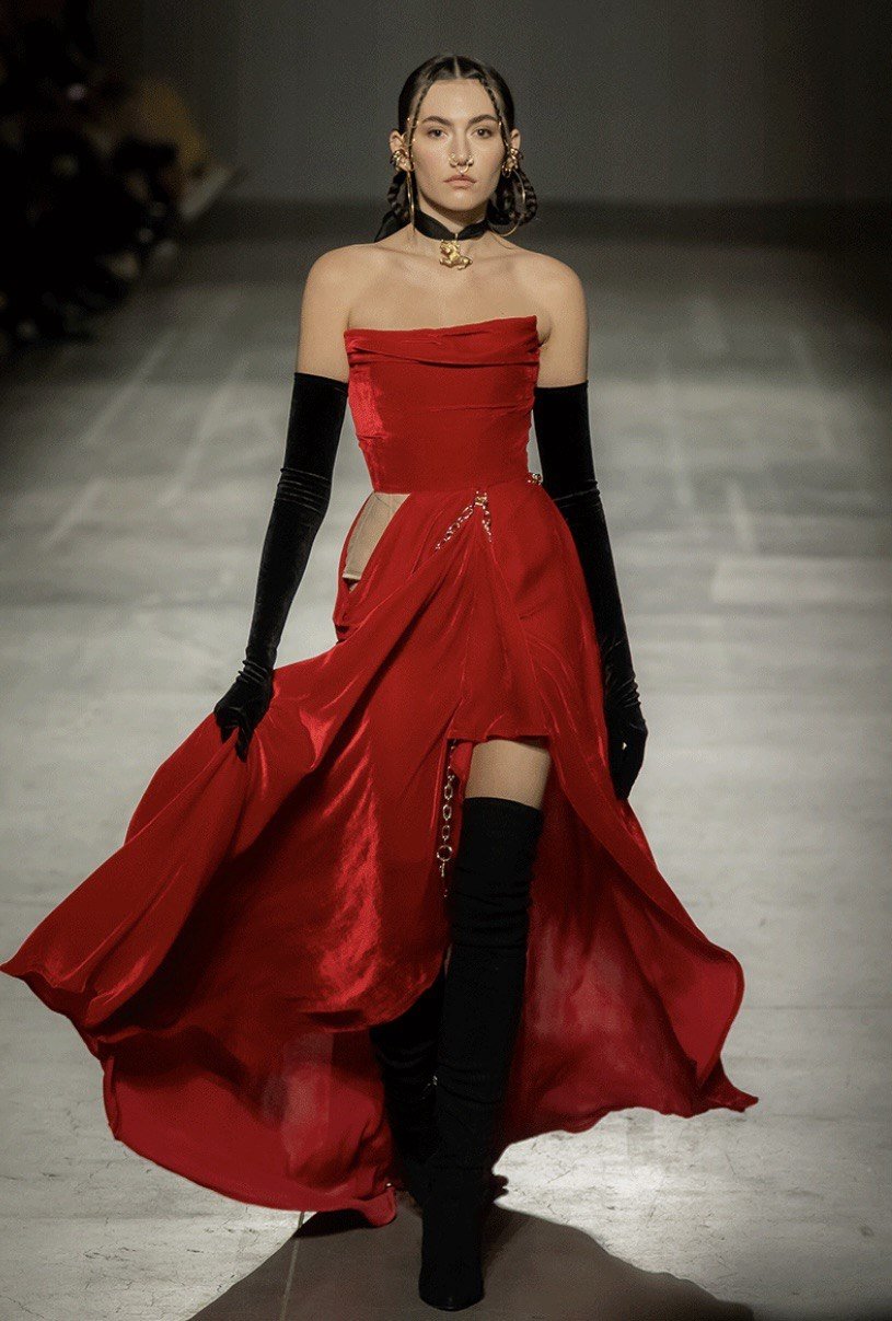 Звезда "Холостяка" надела соблазнительное платье красного цвета, изготовленное из премиального шелкового бархата. Высокий разрез подчеркнул хрупкость ног, а открытое бедро придало пикантности и сделало образ смелым и чувственным. Также платье имеет акцентную деталь — цепь — она придала выразительного характера. К наряду Анастасия подобрала черные сапоги-чулки, акцентные украшения и длинные перчатки. Смелая заявка на "платье мести", не правда ли? 🔥😍
