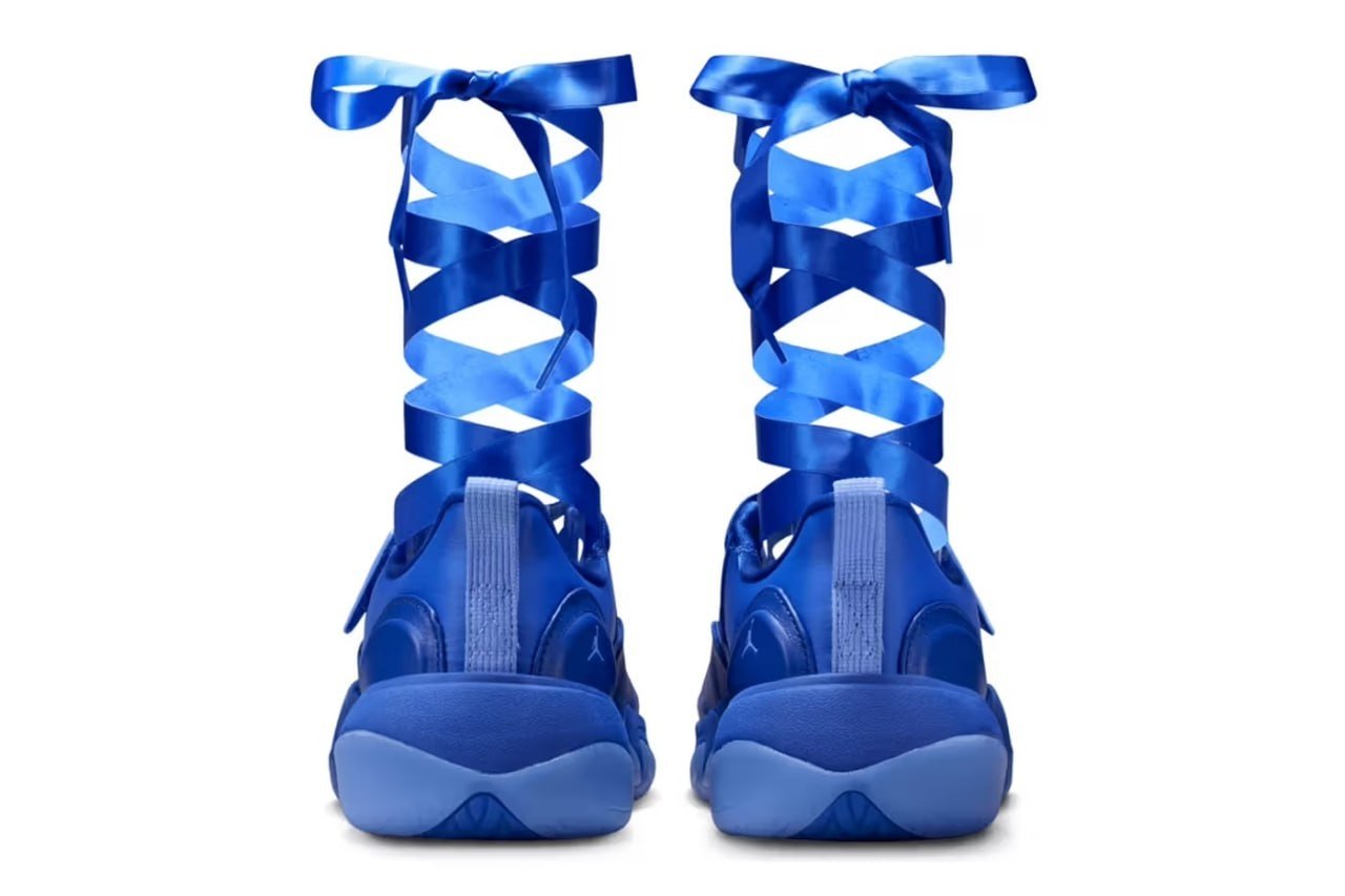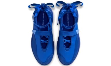 Новинка сочетает массивную подошву с нетипичными для кроссовок деталями: вместо шнуровки – липучка, а образ дополняют атласные ленты, отсылаемые в балетную эстетику. Модель выполнена в насыщенном оттенке Hyper Royal – королевском синем, придающем дизайну выразительности.