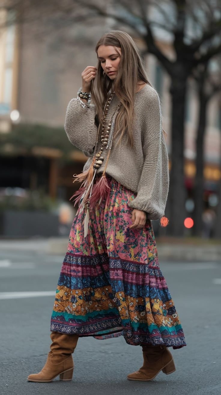 Не ждите лета, чтобы примерить бохо-юбку. Попытайтесь носить ее уже сейчас с грубыми ботинками и объемным свитером большой вязки — игра на контрасте нежной ткани и тяжелого трикотажа всегда выглядит беспроигрышно,