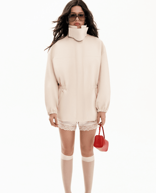 Высокий воротник-стойка формирует более закрытый и структурированный силуэт. Такая деталь придает образу сдержанности и графичности, а также визуально извлекает пропорции.