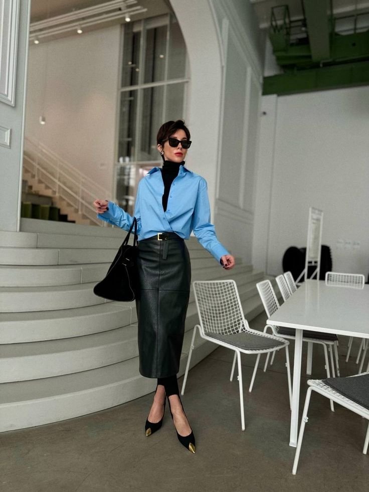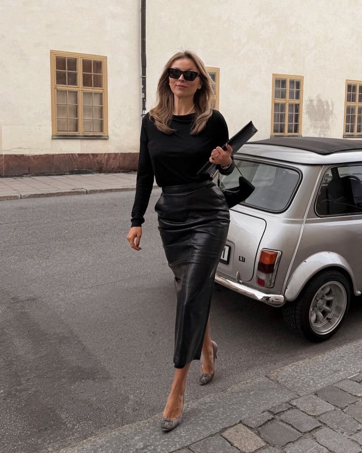 • Длинная кожаная юбка с разрезом. Один из самых популярных вариантов, придающий образу нотки соблазнительности. В сочетании с правильным верхом и аксессуарами смотрится эффектно и незабываемо. На каждый день можно носить с однотонной хлопковой футболкой или простым топом без принтов. А для особых событий — с интересной блузой и украшениями.