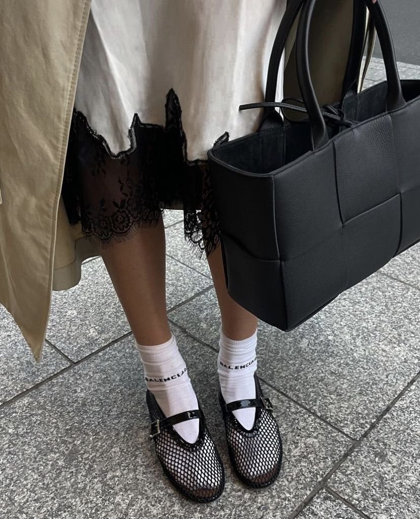 Тренд последних сезонов — балетки из сетки — осенью не теряет актуальности. Секрет адаптации прост: добавьте носки. Бежевые, чёрные, цветные или даже ярко-алые — они превращают балетки в элемент для бесконечных экспериментов, а ваш образ делают уникальным и смелым.