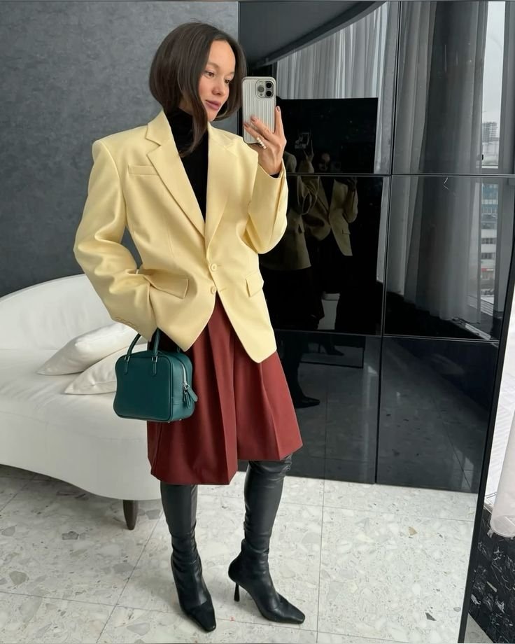 Тот самый Butter Yellow, который летом гармонировал с пастелью, в осеннем гардеробе раскрывается в новом ключе. Сочетайте его с глубокими оттенками — чёрным, бордовым или синим. В результате даже самый спокойный образ заиграет свежестью и добавит солнечного настроения в пасмурные дни.