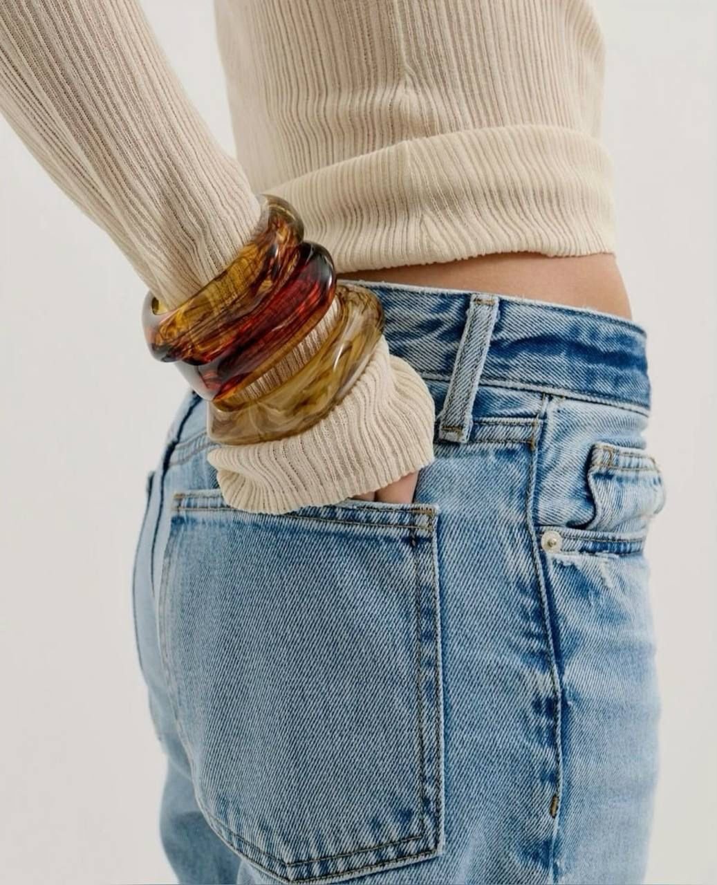 Массивные смоляные аксессуары возвращаются в центр внимания. Если летом они украшали обнажённые запястья, то теперь смело надевайте их поверх тонких свитеров, лонгсливов и даже пиджаков. Такой акцент легко «прокачает» даже базовый аутфит.