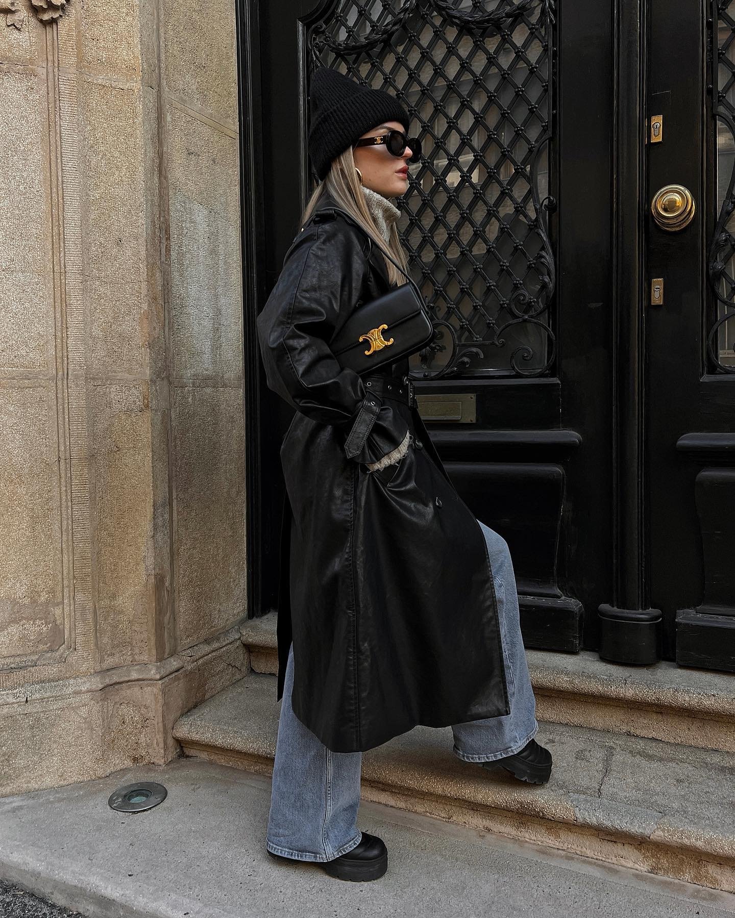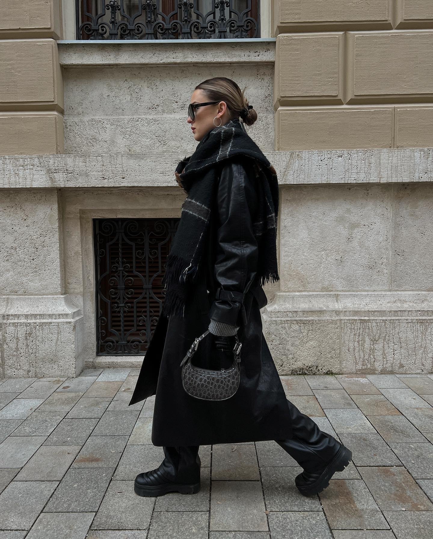 Главное — правильно подобрать обувь под кожаный плащ. Каблуки — конечно, классика, но их лучше оставить для вечерних событий. А на каждый день выбирайте ботинки на массивной подошве и спортивную обувь.