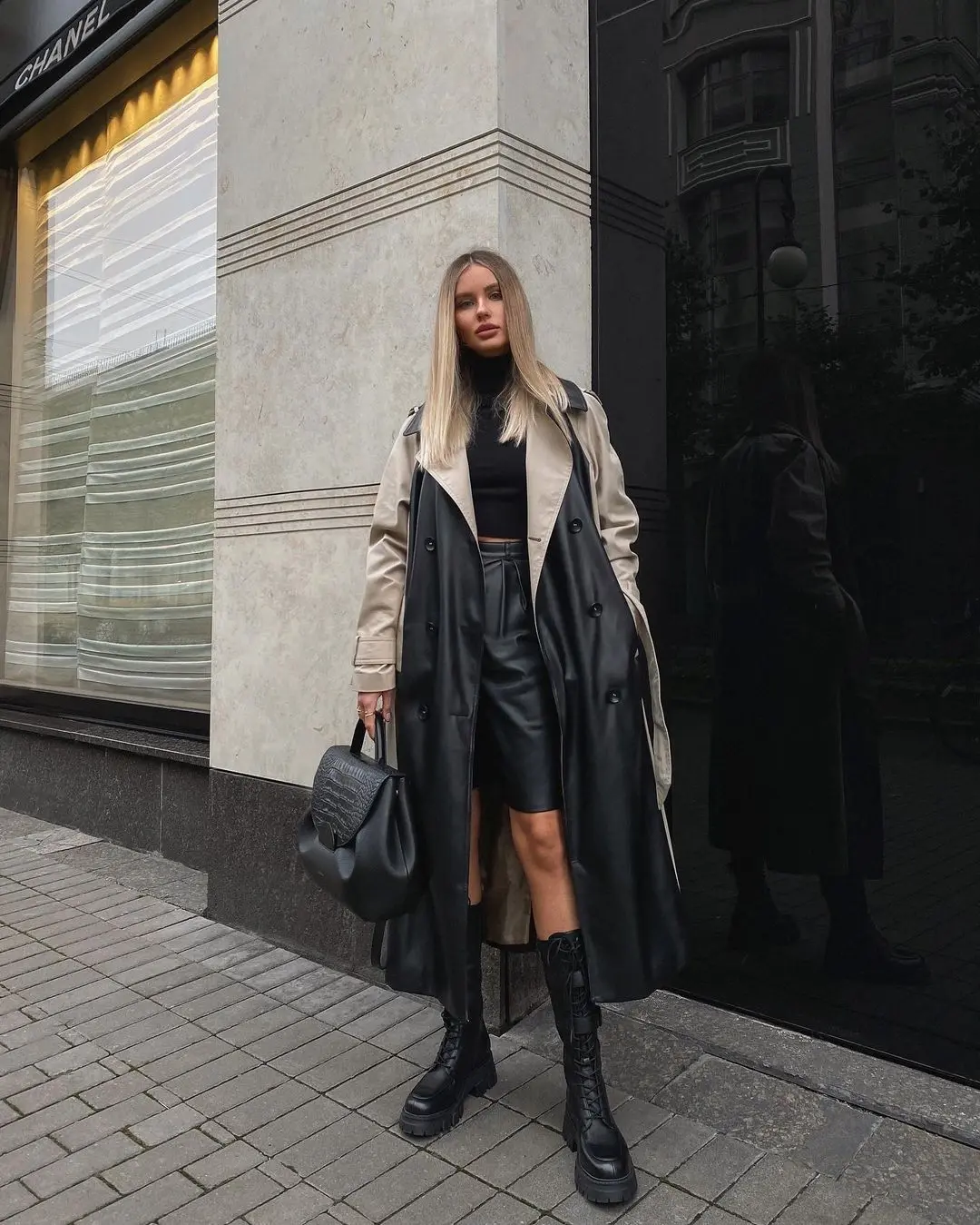 Если носить плащ расстегнутым, можно добавить образ интриги с помощью мини-юбки или коротких шорт. Они подчеркнут ваши ноги и сделают силуэт более стройным.