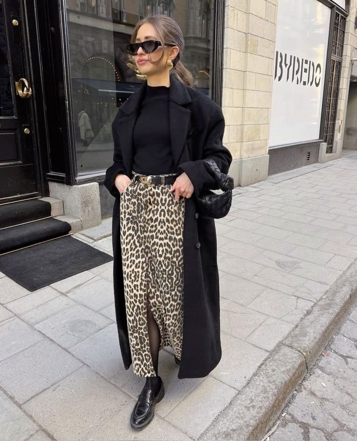 Осенью леопард выглядит прекрасно рядом со сдержанными тонами — черная водолазка, темно-синие джинсы или бежевое пальто идеально уравновешивают яркий рисунок, делая лук гармоничным и стильным. Однако не менее интересно выглядят наряды, где леопардовый принт присутствует как главный акцент — шуба, пальто, брюки или юбка.