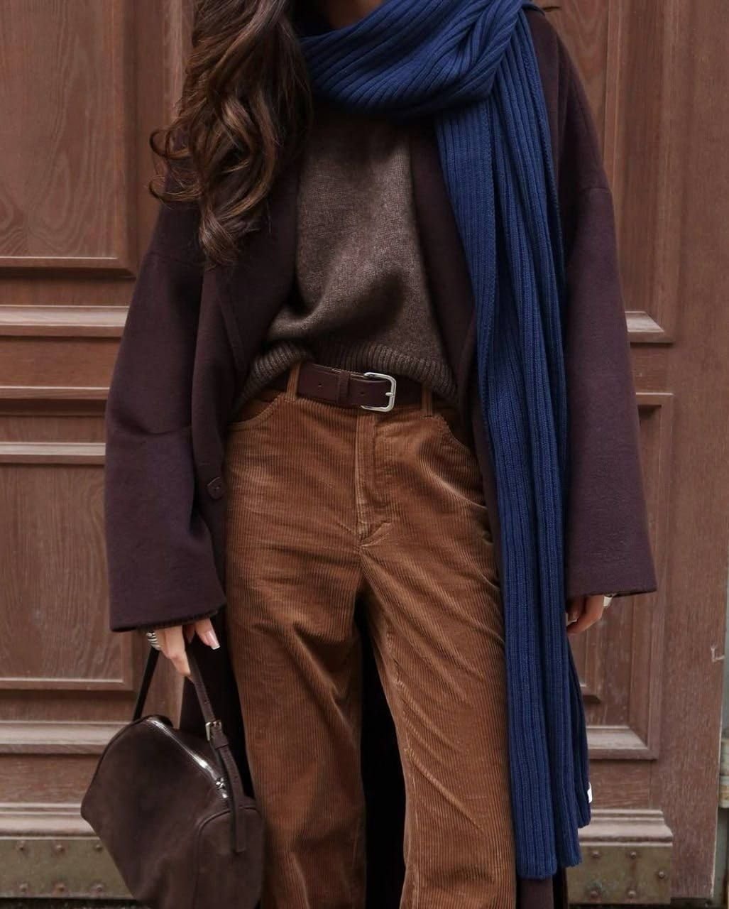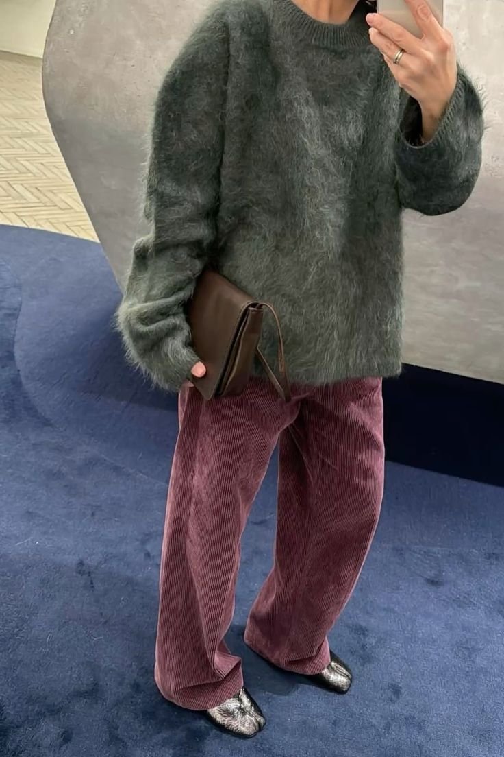 Вельвет традиционно ассоциируется с глубокими, теплыми зимними оттенками — шоколадным, бордовым, насыщенным зеленым. Они совершенно раскрывают богатую фактуру ткани. Поэтому если вы хотите познакомиться с этим материалом, выбирайте штаны. Совмещать их можно с базовыми вещами спокойной гаммы — любимыми свитерами, гольфами или кардиганами.