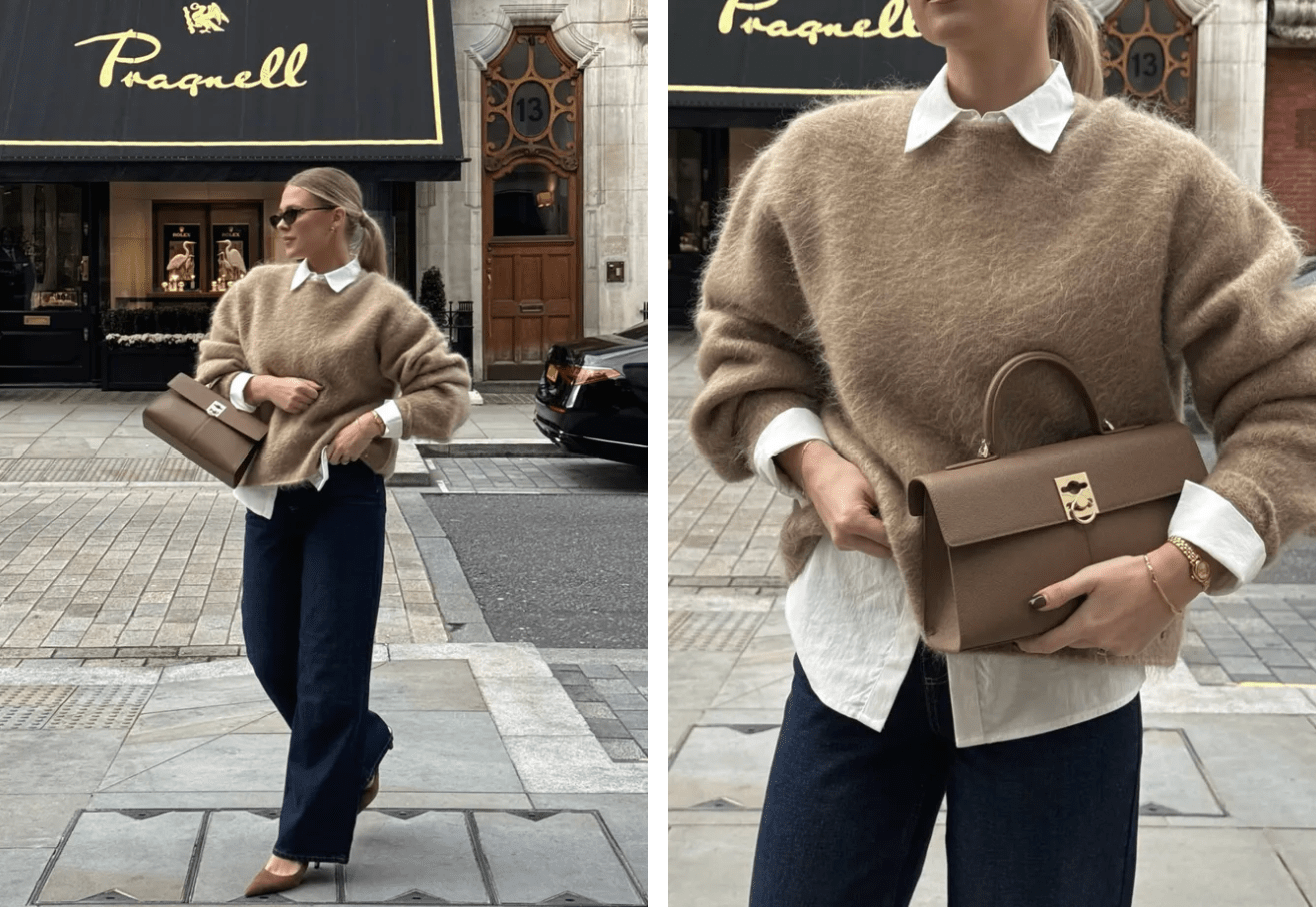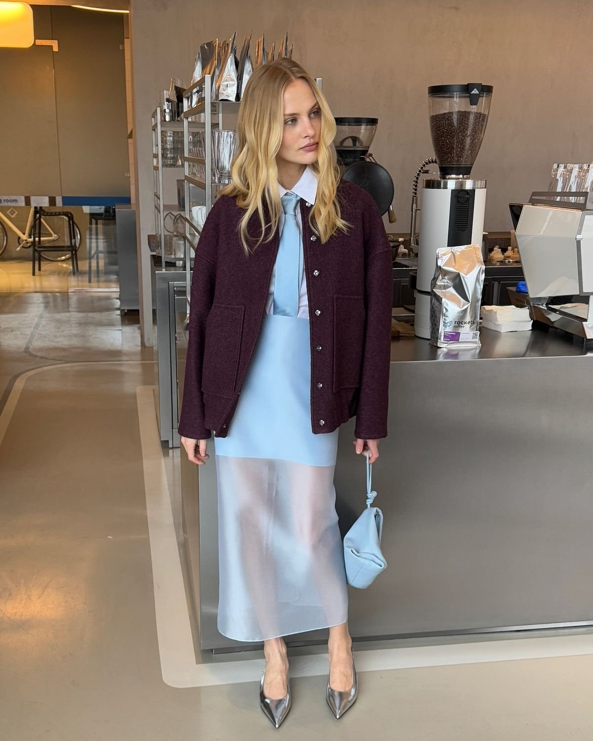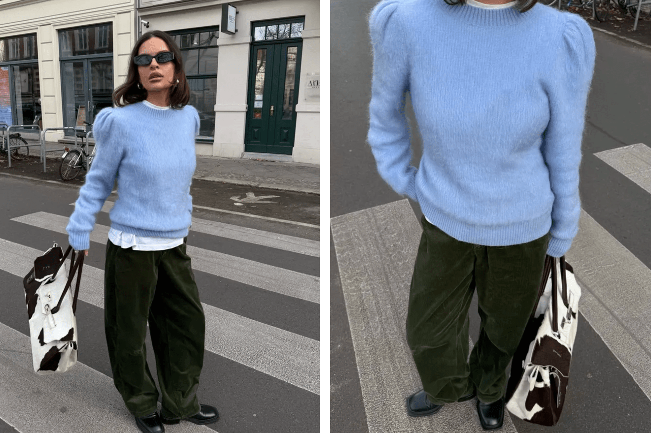 Три цвета, которые идеально играют вместе. Молочный придает мягкости, голубой дарит свежесть, а коричневый становится сдержанным акцентом. Образ универсален и подходит везде — от офиса до дружеской прогулки.