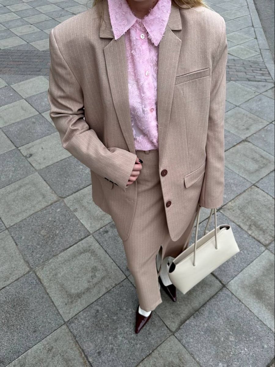 В дни, когда совсем не хочется придумывать сложные луга, спасает классика. Пастельный беж в паре с темно-синим всегда работает. Светлый джемпер, темно-синие брюки — и образ уже выглядит элегантно сам по себе.