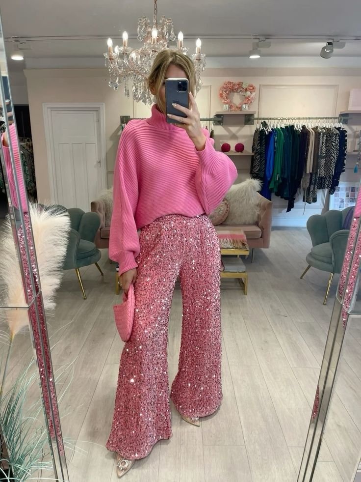Уютный свитер и блестящие брюки