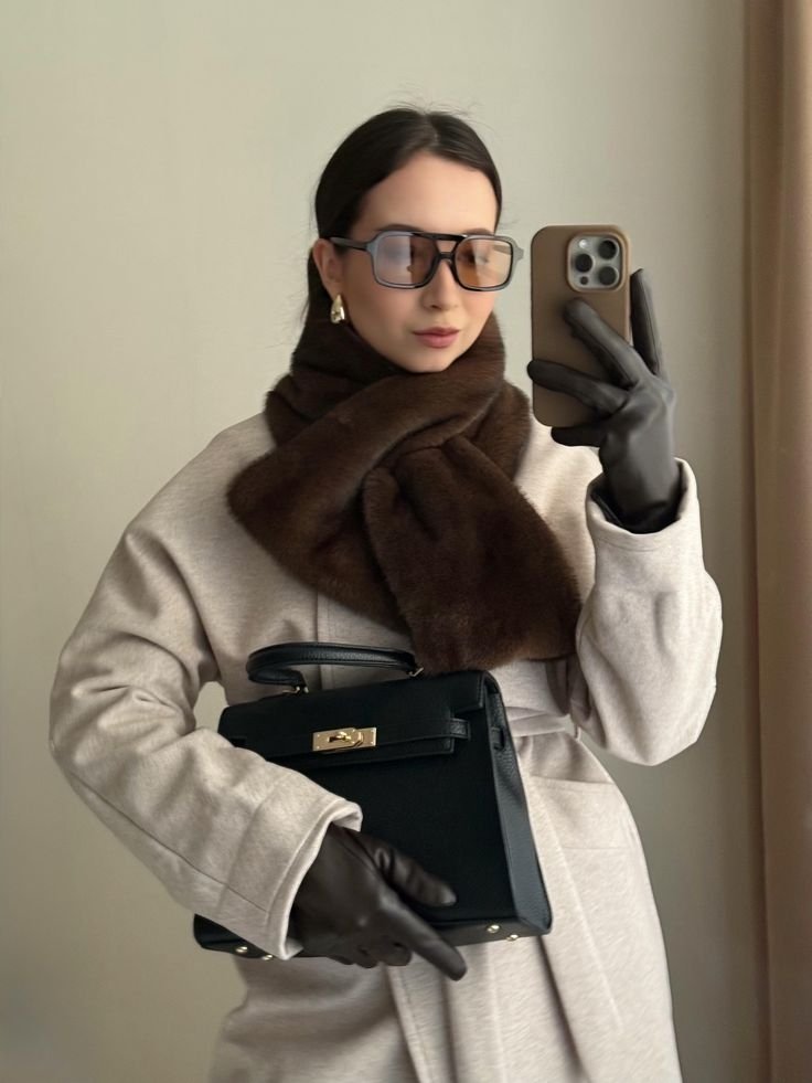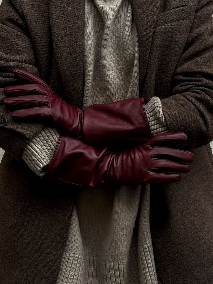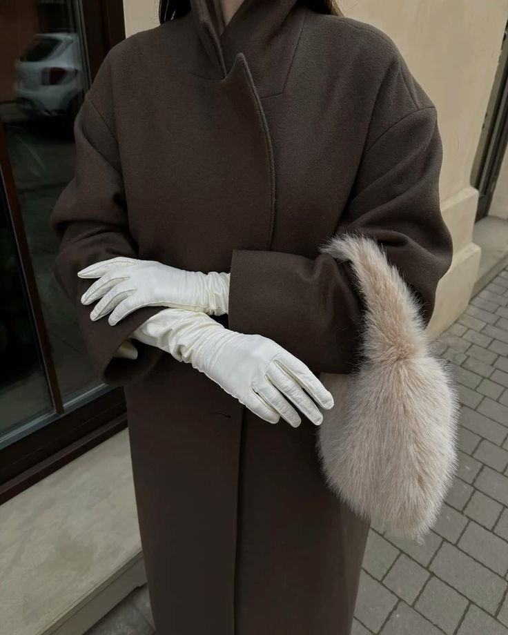 Беспроигрышный выбор — лаконичные кожаные перчатки. Это вневременная классика, которая всегда выглядит дорого. Черные, темно-коричневые, винные или графитовые оттенки придают образу изысканности и легко сочетаются как с пальто, так и с повседневными лугами.