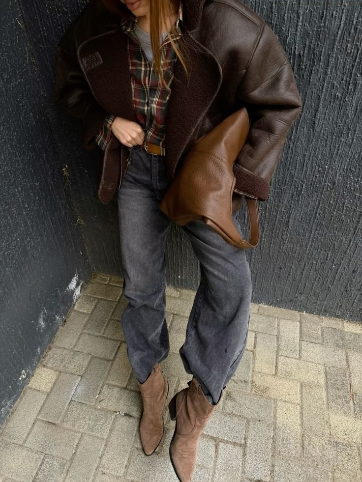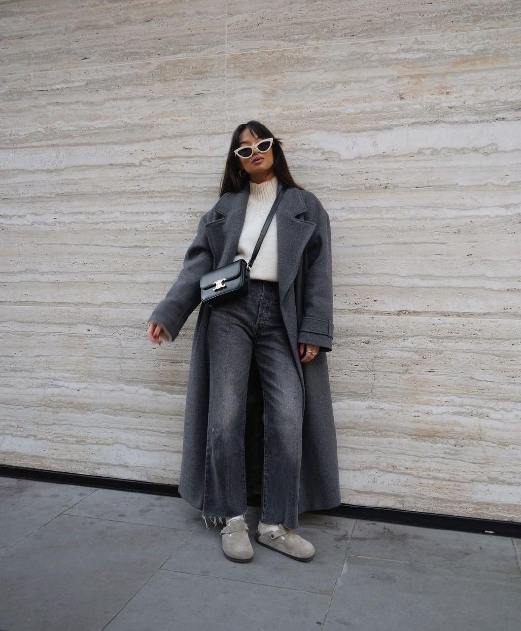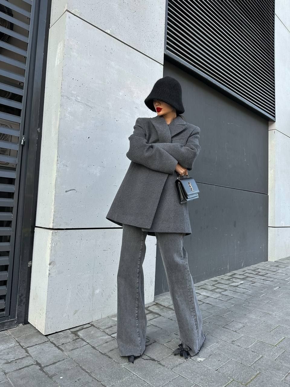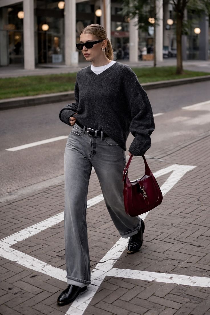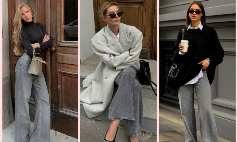 Как и с чем носить серые джинсы в 2026 году? Особенно эффектно такой деним сочетается с объемными силуэтами — массивными бомберами, длинными пальто, фактурными свитерами.