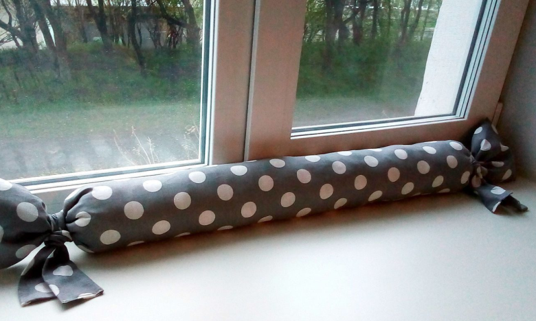 Чтобы сделать такой валик, нужно сшить длинный и узкий мешочек из плотной ткани. Прогрейте соль на сковороде и насыпьте ее внутрь. Такие мешочки по ширине окна следует положить на каждый подоконник.