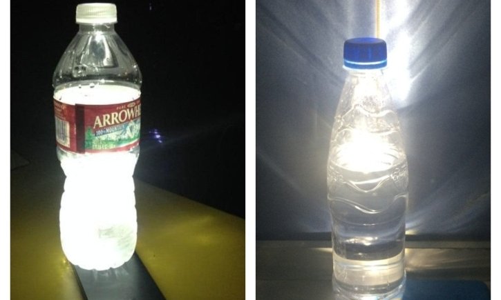 Чтобы сделать фонарик телефона или обычный LED-фонарь более мягким и рассеянным, на него можно поставить бутылку с водой. Она должна быть прозрачной, полной или наполненной до половины.