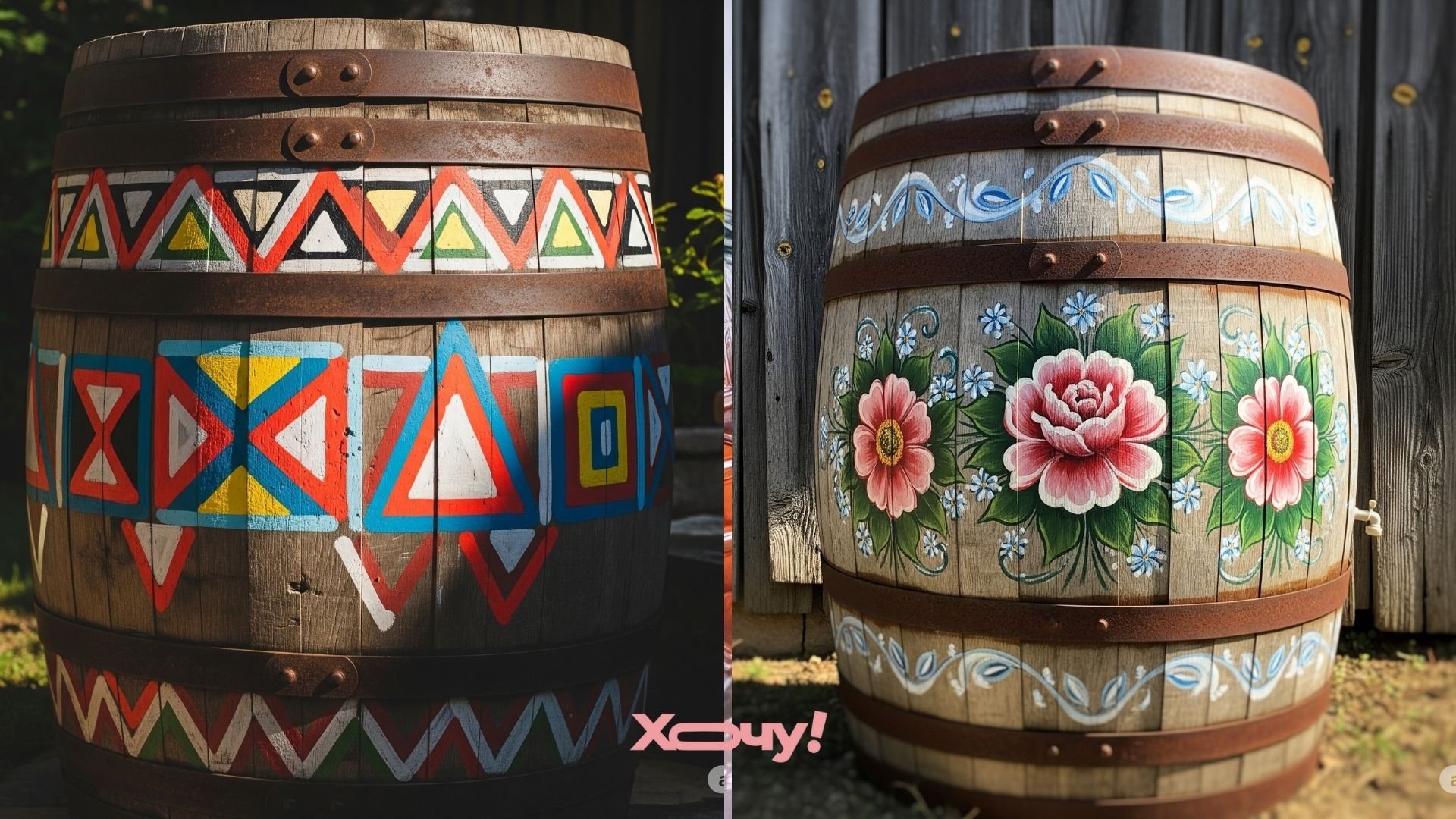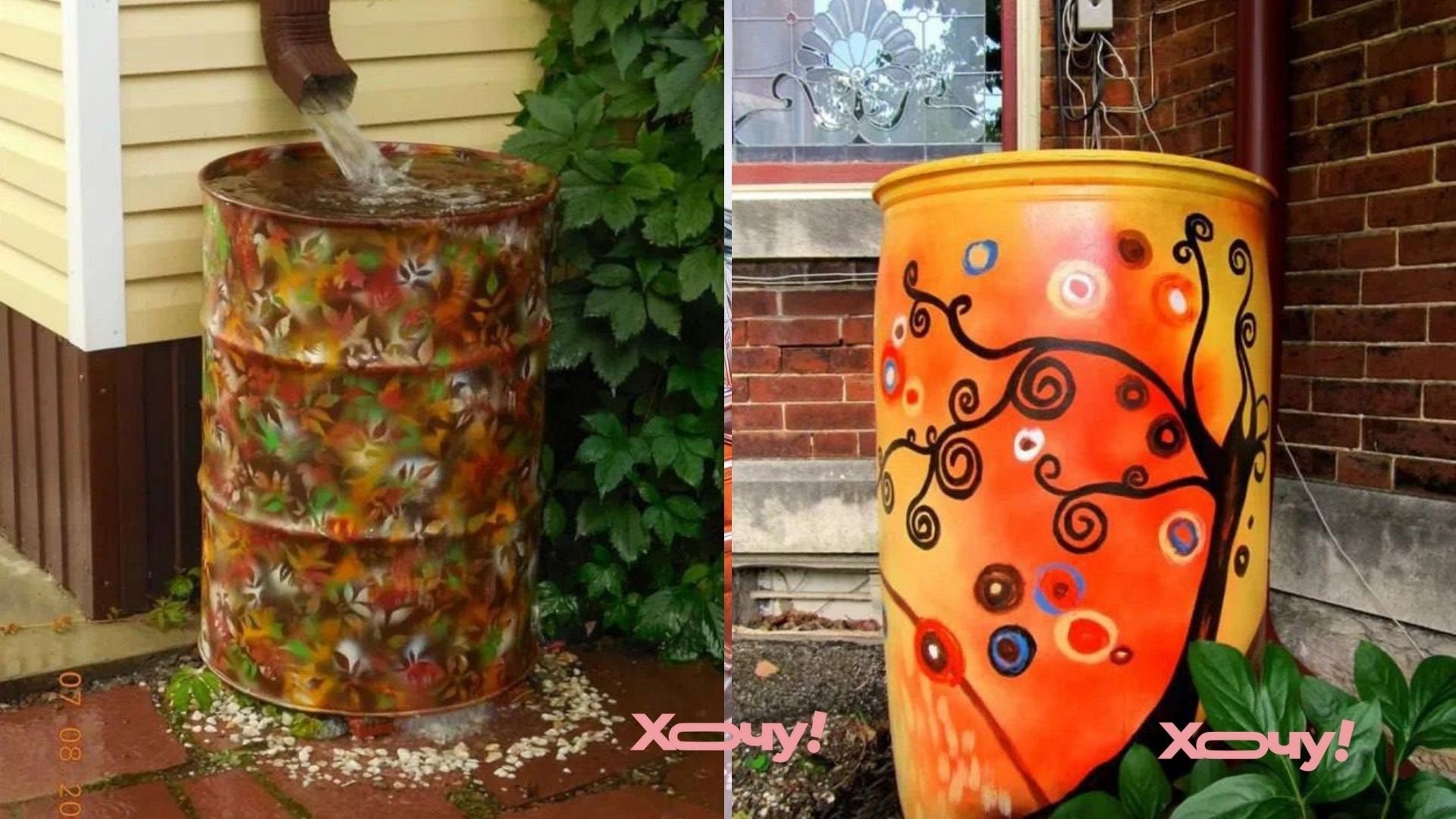 Если вам нравится минимализм, достаточно выкрасить бочку в однотонный цвет, чтобы сливался со средой. Можно раскрасить цветами, животными или зеленью, или, как старое дерево, камень, кирпич или даже гигантская чашка. Создать красивые узоры можно с помощью трафаретов.