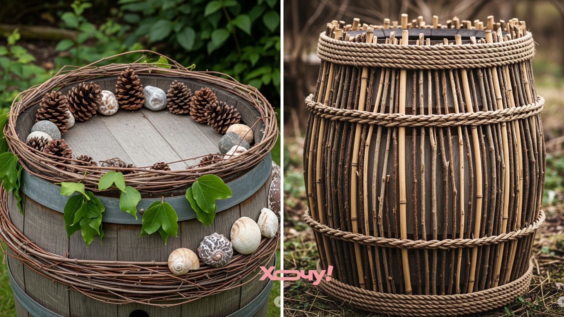 Приклейте к бочке ветки, листья, шишки, камни или ракушки. Это придаст ей естественный вид.
