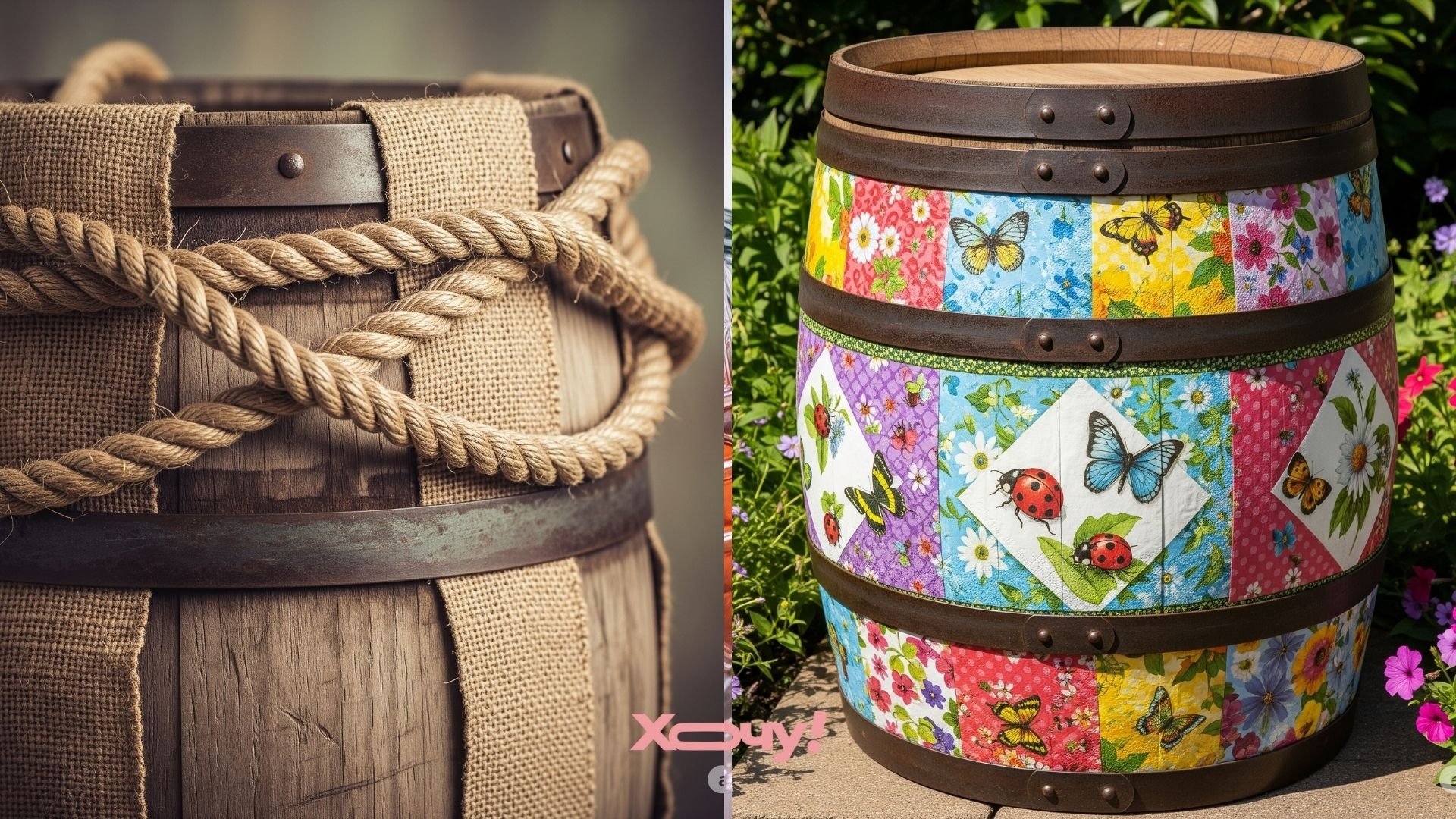 Декупаж вам в помощь. Положите бочку и обклейте ее салфетками или распечатанными изображениями и полакируйте. Обмотайте шпагатом или веревкой. Начните клеить веревку по спирали снизу вверх, используя термопистолет или водостойкий клей. Обмотайте тонкими палочками или бамбуком.