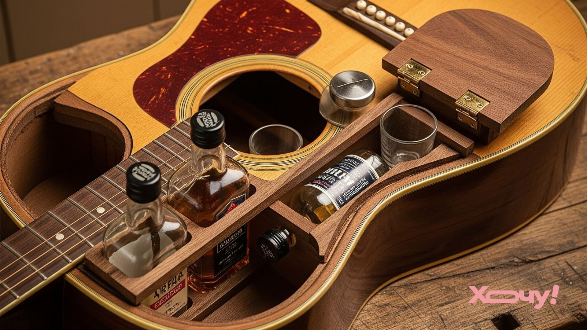 Эта идея идеально подойдет тем, кто ценит оригинальные и функциональные вещи. Надо снять одну из боковых стен гитары и обустроить внутри небольшое отделение. Его можно использовать как минибар для бутылок и бокалов или как творческий тайник для ценных предметов.