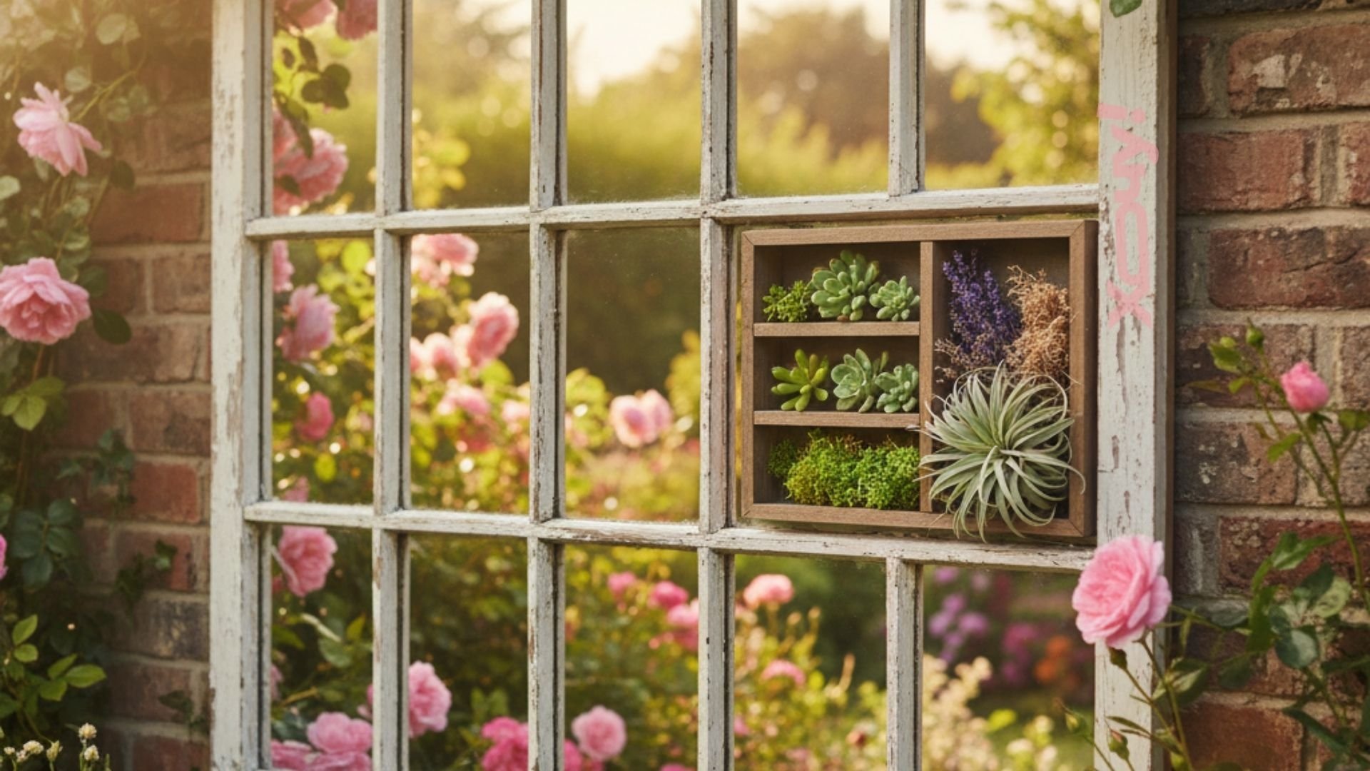 Превратите раму в большую фоторамку или зеркало, разобрав ее. Вместо стекла можно вставить зеркало (для визуального расширения сада) или использовать его в качестве основы для создания художественной композиции из мха, сухоцветов или небольших полочек для суккулентов.